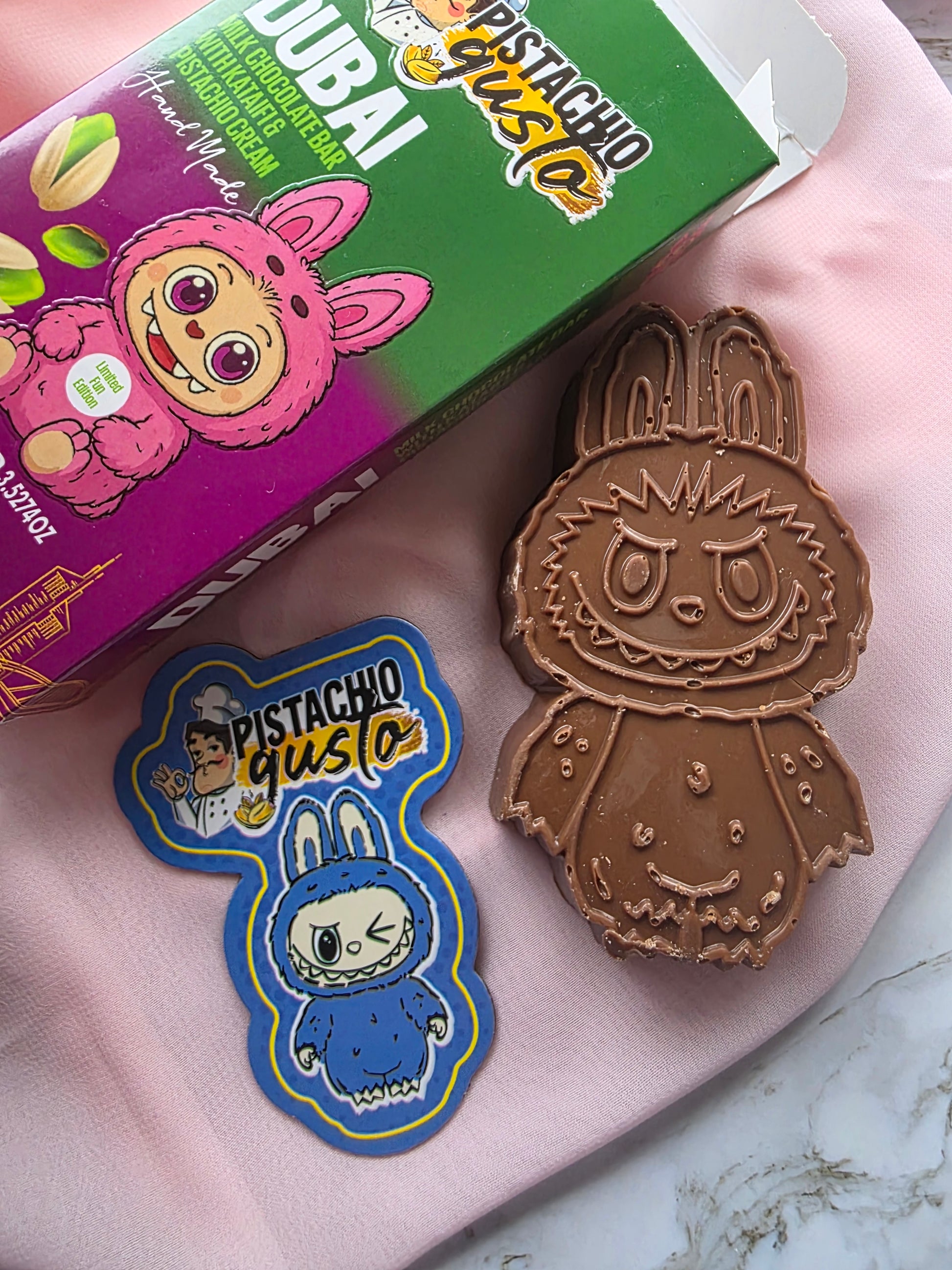 Experience chocolate like never before with the Limited Edition Labubu Inspired Dubai Chocolate Bunny Bar. Crafted from smooth, premium Belgian chocolate, this 3D bunny-shaped bar combines playful artistry with rich flavour for a treat that’s as eye-catching as it is indulgent.
